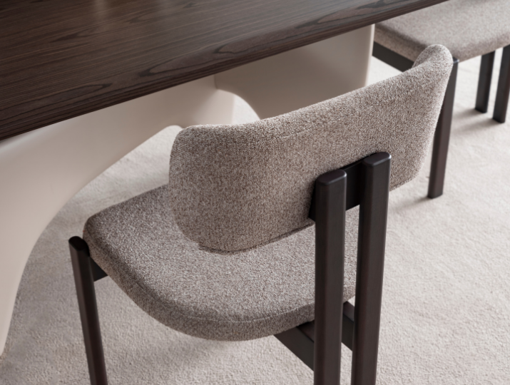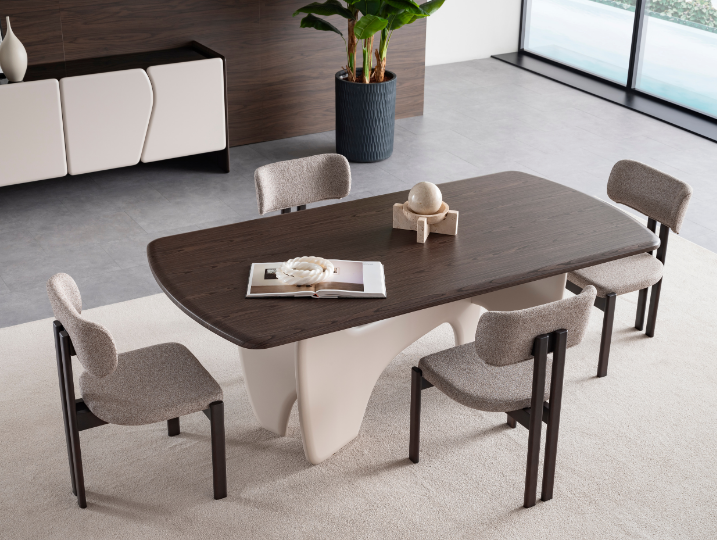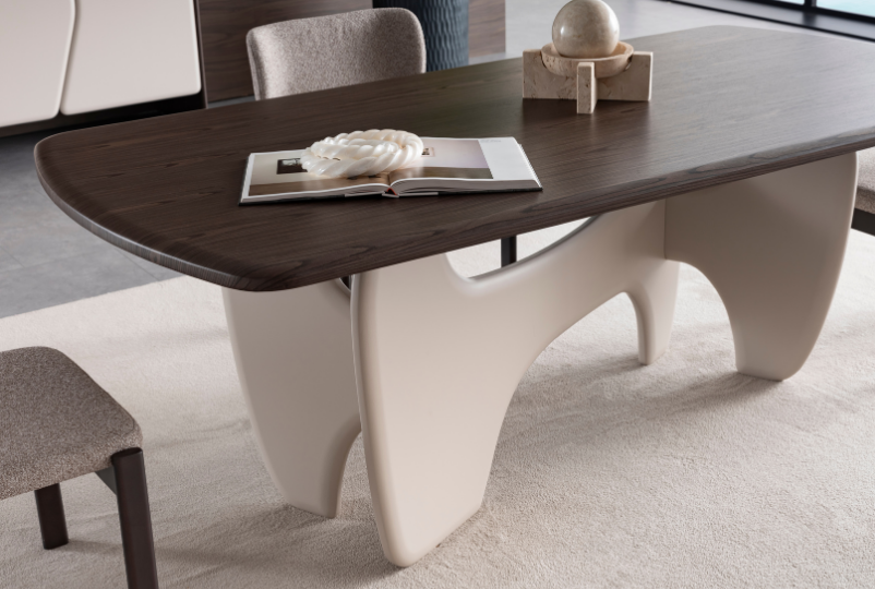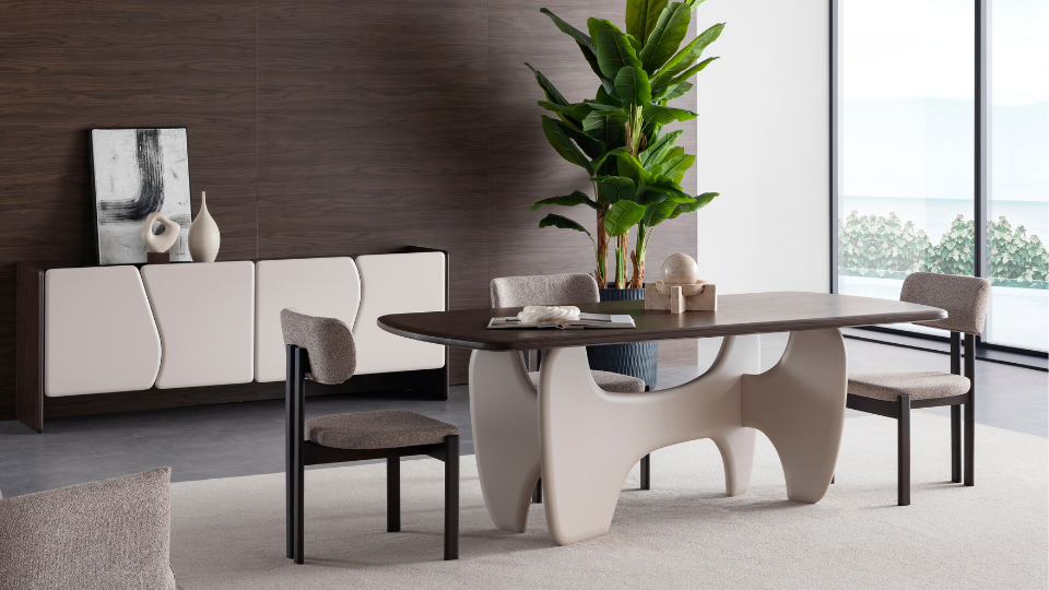 Elysia Yemek Masası, heykelsi tasarımıyla yemek odanıza benzersiz bir karakter kazandırır. Parlak koyu ahşap tabla ile modern beyaz organik ayakların birleşimi, kontrastın şıklığını yansıtır. Hem sanatsal bir dokunuş hem de güçlü bir kullanım sunan bu masa, geniş yüzeyi ile aile yemekleri ve davetler için mükemmel bir seçimdir.