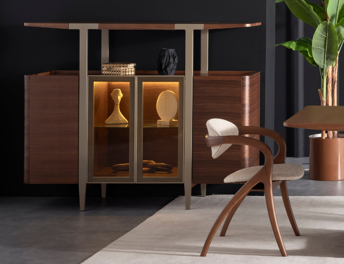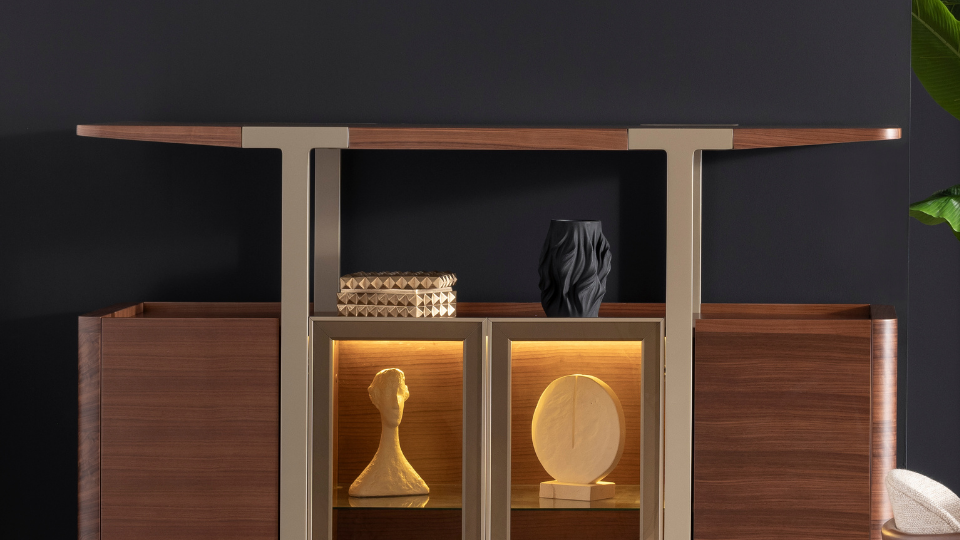 Linea LED Işıklı Ahşap Büfe, zamansız ahşap dokusu ve zarif metal çerçevesiyle modern yaşam alanlarına sofistike bir görünüm kazandırır. İç kısmındaki LED aydınlatma sistemi, cam kapakların ardında sergilenen eşyalarınızı ön plana çıkarırken sıcak bir atmosfer yaratır. Geniş depolama kapasitesi ve estetik tasarımıyla yemek odası, salon ya da oturma alanlarınıza hem fonksiyonellik hem de dekoratif değer katar.