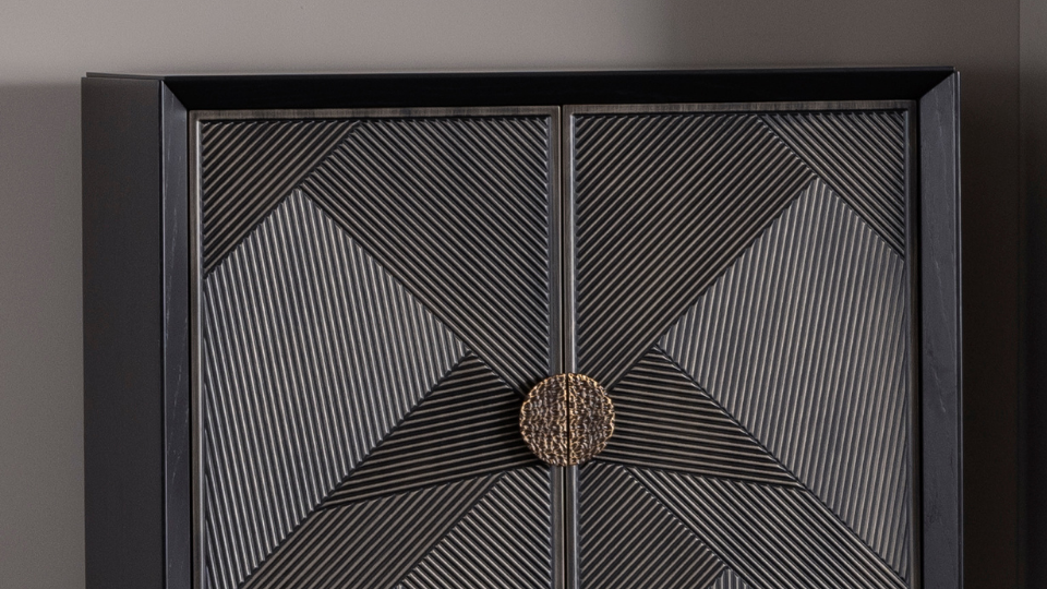 The Liora Black High Cabinet by Maya Deluxe Store combines elegance with practicality. Crafted from wood, it features cabinet doors with intricate geometric patterns and bronze-detailed round handles, adding a touch of modern artistry. With its tall design, it serves as both a stylish display cabinet and a functional storage solution.